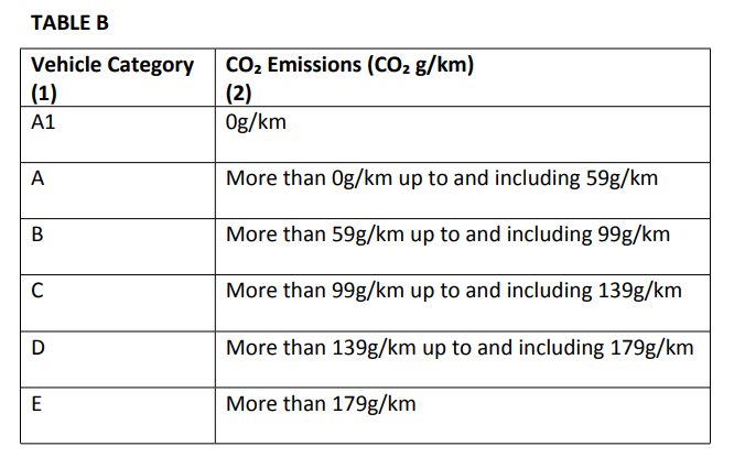 Determine the applicable vehicle category from Table B based on the amount of CO2 g/km the vehicle produces